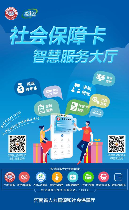 河南社会保障卡智慧服务大厅已在“河南社会保障卡”微信公众号和支付宝生活号 发布!提供社保卡、社会保险、人事人才、证书查询、智慧出行、社保卡金融等一站式服务。