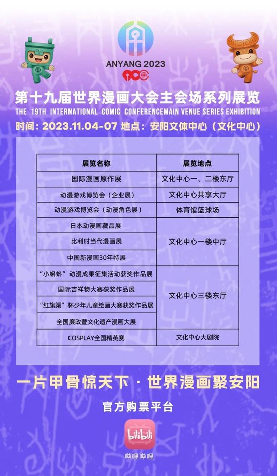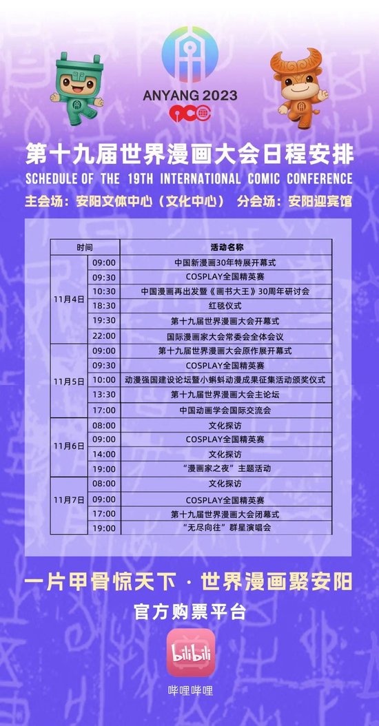 据了解,第十九届世界漫画大会由安阳市人民政府、国际漫画家大会中国委员会、河南省文化和旅游厅等联合主办。大会主题为“用漫画连接世界,以漫画面向未来”。大会主要活动有开幕式、闭幕式、主论坛、漫画家文化探访、漫画家之夜、COSPLAY全国精英赛等。会议期间还将举办国际漫画原作展、日本动漫画藏品展、比利时当代漫画展、中国漫画30年特展、“小蝌蚪”动漫成果征集活动获奖作品展、国际吉祥物大赛获奖作品展等系列展览。