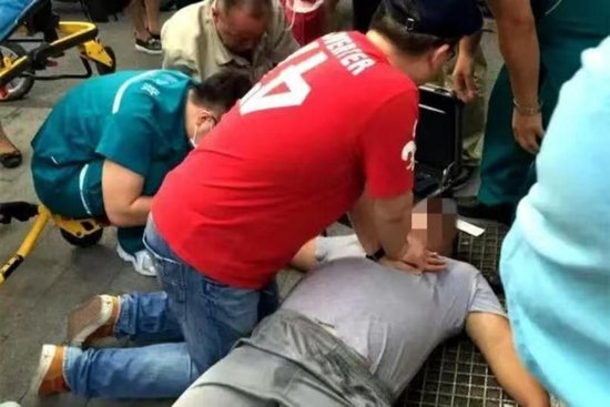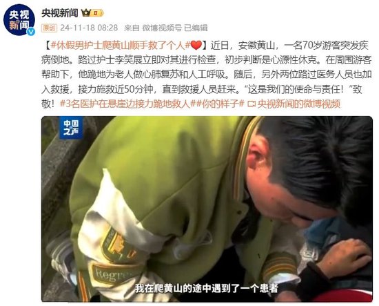 11月10日,安徽黄山,一名70岁游客突发疾病倒地。路过护士李笑展立即对其进行检查,初步判断是心源性休克。在周围游客帮助下,他跪地为老人做心肺复苏和人工呼吸。随后,另外两位路过医务人员也加入救援,接力施救近50分钟,直到救援人员赶来。