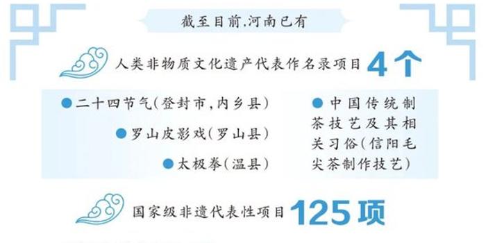 截至目前,河南已有人类非物质文化遗产代表作名录项目4个,国家级非遗代表性项目125项,国家级非遗代表性传承人160位,省级非遗代表性项目1030项,省级非遗代表性传承人1147位。
