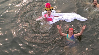记者在现场看到,这些参赛者最大年龄接近70岁,最小则刚刚20岁,她们不仅在指定水域内畅游,还与男性冬泳队员互动,参加“盛装下水”、“英雄救美”等别开生面的活动和游戏,为围观游客真实演绎冰河里的“彻骨”浪漫,热闹非凡。
