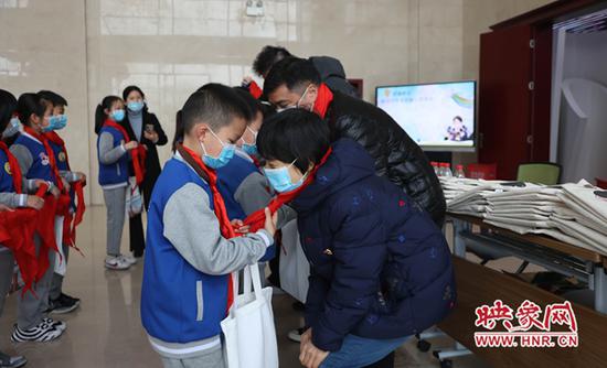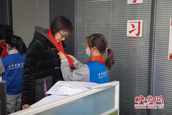 图:小朋友为大象融媒体集团党委副书记、总编辑姚菊清女士戴上红领巾。