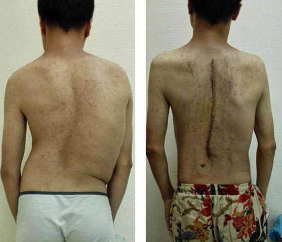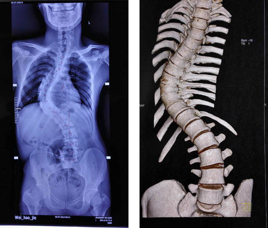 在入院后,医生对小魏进行了详细的检查:躯干向左侧倾斜,右肩比左肩高2cm,脊柱右侧凸,右侧“剃刀背”畸形,高约4cm,右侧锥旁肋骨隆起畸形,站立身高157cm。拍片结果显示:下胸椎多节分节不全,侧弯Cobb角高达82°,且为椎体分解不良,僵硬型脊柱侧弯。