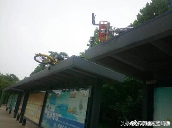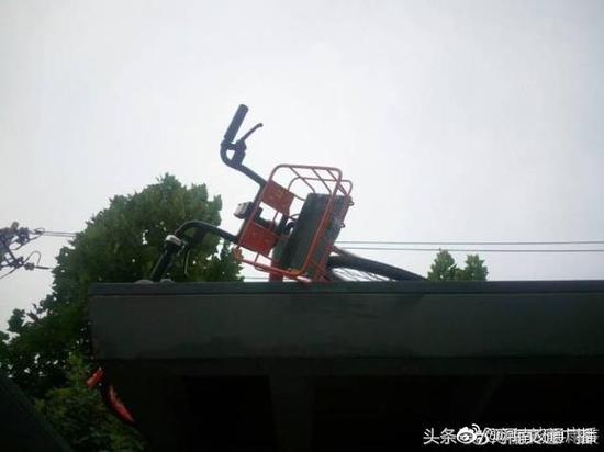 共享单车飞到郑州一公交站牌顶上 这是要上天呀