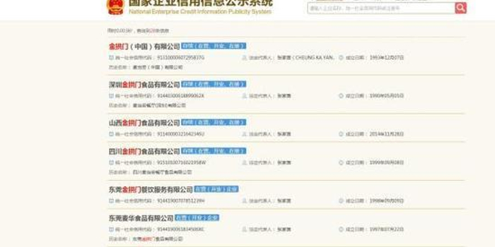 记者登录国家企业信用信息公示系统,输入“麦当劳”,搜索结果出现的第一位是上海麦当劳食品有限公司,第二名则是金拱门(中国)有限公司,其历史名称写着“麦当劳(中国)有限公司”。