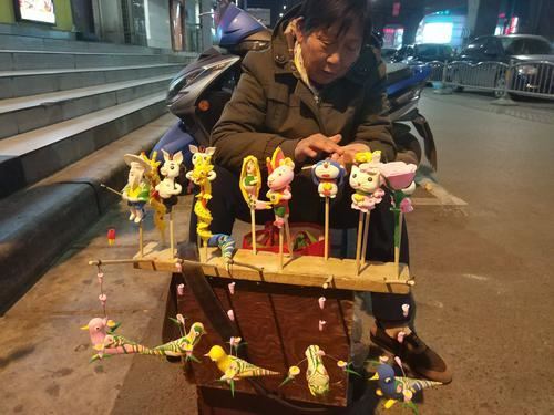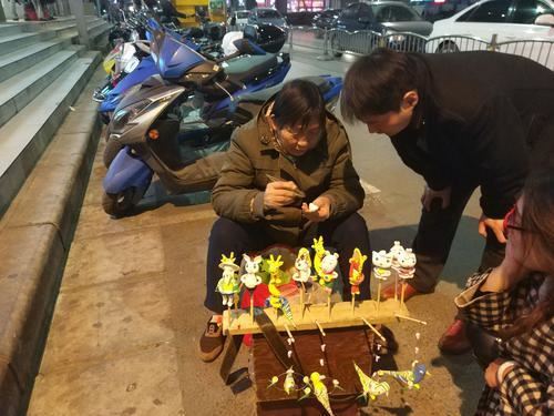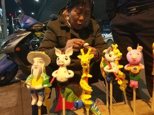 10月29日晚,在郑州市中原区陇海路立交桥下,一位老太太正在路灯下捏面人儿。在老太太的摊位周围站满了围观的市民。摊位上挂着孙悟空、猪八戒、姜子牙钓鱼、各种彩色的鸟等面捏的小人儿和小动物,它们活灵活现地呈现在人们面前。老太太认真地做面人,有市民选好要买哪一个时,老太太才停下手里的活儿,拿出面人儿递给市民。