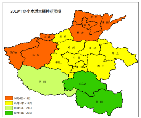 冬小麦适宜播种期大部接近常年。根据我省冬小麦常年播种日期,考虑麦播期和越冬前的气候趋势预测结果,从提高出苗质量和培育冬前壮苗角度分析,预计今年我省冬小麦适宜播种期豫西南和豫南地区较常年偏晚2~5天,其他大部分地区接近常年。最适播种期:豫西和豫北大部为10月6-14日,局部丘陵山区可适当提前,但不宜早于10月1日;豫西北局部、豫中和豫东大部为10月10-19日;豫西南地区为10月16-24日,豫南地区为10月18-28日。