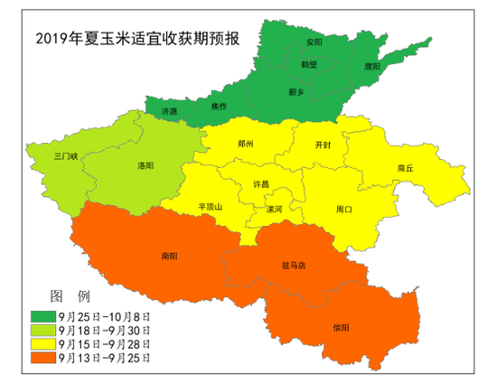 大部地区夏玉米收获期较常年提前,豫北地区略偏晚。根据当前夏玉米发育进程,预计2019年豫西南、豫南地区较常年提前4~7天,适宜收获期为9月13-25日;豫中及豫东地区提前4~5天,适宜收获期为9月15-28日;豫西地区提前1~2天,适宜收获期为9月18-30日;豫北地区较常年偏晚3~6天,适宜收获期为9月25日-10月8日(图6)。