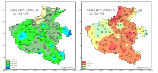 各地降水量为111.5毫米(获嘉)~566.4毫米(永城),与常年同期相比,除豫西大部和中东部局部略偏多2成以内外;其它地区降水偏少1~7成,其中豫北、豫东和豫南局部偏少5成以上(图4),武陟、辉县、博爱、修武、民权5站为建站以来同期最少值,焦作为次少值。