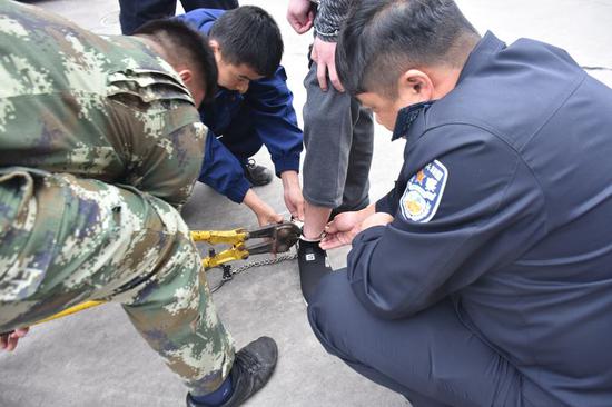 当获知民警的来意后,消防人员开始着手开脚铐,但发现脚铐铐的相当紧,而且这种脚铐是新式脚铐,硬度较以往的又有所增大。按照以往经验,这种脚铐既然已经损坏,要摘除只能切割或剪断。但如果直接用切割机等救援工具切割,又容易对嫌疑人造成伤害。经过简单讨论研究后,指战员决定利用手动剪断钳对脚铐进行剪切。为了防止操作时伤到脚腕,不给嫌犯带来意外伤害,一名消防员用手固定好脚铐下,另一名消防员实施剪切,经过几次反复剪切,最后只听“咔”的一声,牢固的脚铐终于被消防队员剪开。嫌疑犯揉着自己红肿的脚腕也是欲哭无泪,没有想到,自己犯罪了连脚铐也欺负自己。