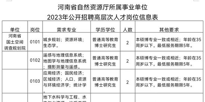 关注根据《事业单位人事管理条例》《河南省事业单位公开招聘工作规程》和《河南省事业单位招才引智“绿色通道”实施细则》等有关规定,为优化专业技术人才队伍,提升创新发展活力和业务支撑能力,我厅所属河南省国土空间调查规划院、河南省自然资源监测和国土整治院、河南自然博物馆和河南省自然资源综合保障中心等4家事业单位拟面向社会考试引进17名高层次人才,具体实施方案如下: