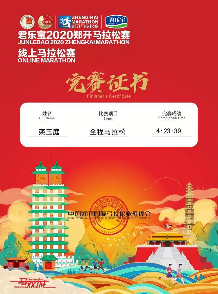 非常时期,非常之举。非常感谢郑开组委会举办了线上马拉松、不让“约定”延期。我也于2020年3月29日用时4:23:39独自跑完了一个线上全马(42.195公里)。用这种跨越时空的方式来不让我们的“约定”延期,用这种方式去为我们的祖国、我们的人民、为我的家人及援鄂的同行姐妹们加油鼓劲,向抗疫英雄们致敬!