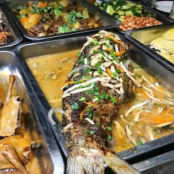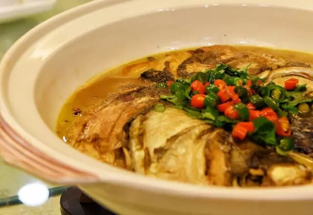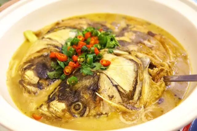 信阳南湾湖花鲢鱼头公认的肥美,清洗鱼头是个费力不显工的活儿,清水洗多遍,不仅要去掉鱼牙,还得除去内壁里的黑膜。在油中煎到金黄,倒入专门的汤料,大火烧开8分钟,小火慢煨十几分钟,最后大火收汁儿,洒上葱花、香菜、青红辣椒圈,上桌,那叫一个鲜美肥嫩。