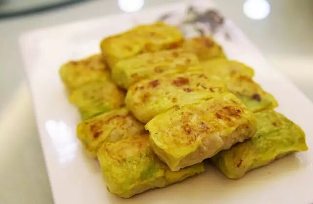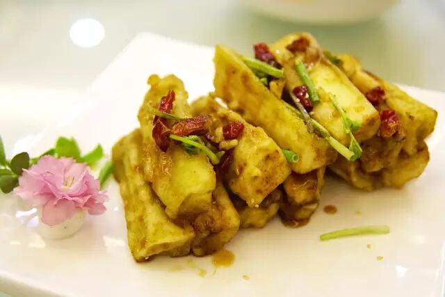 既然主打的是豫菜,十几年积累的经验现如今全给了这些菜品,这款锅贴豆腐是改良版,加入了虾肉和荸荠,外面裹上白菜叶,以煎代炸,吃起来口感非常独特。