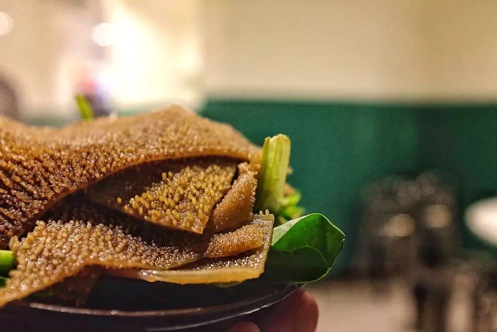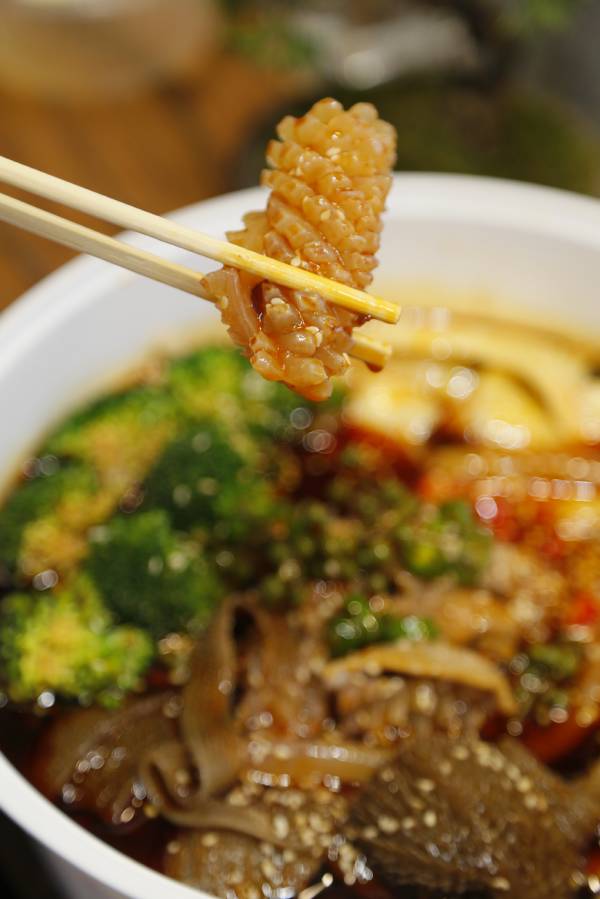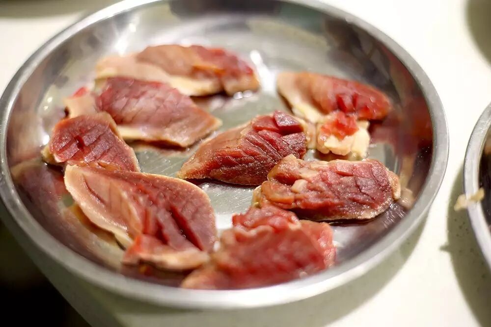 贴心的老板为了让食客能够尝试多种菜品,每一份的分量都不多,这样就可以多吃几种。当然作为有些重口味的重庆火锅,各种动物内脏和下水也是必不可少的。在这里能吃到好多一般火锅店都吃不到的菜品。不经过发酵的新鲜毛肚,脆爽滑嫩,只需在锅里涮几下就可食用。被改成花刀的鸭胗,往锅里涮一涮,美味。从重庆发过来的干贡菜,更是一绝,为了保证口味老板坚持把干的上桌。脆脆的口感,很特别哦!