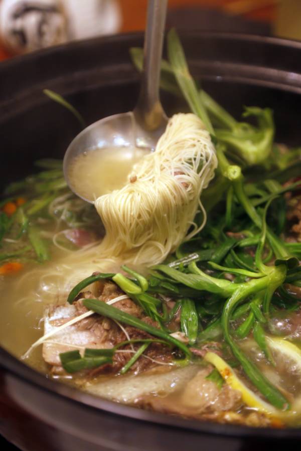 每锅靓汤,不仅免费续汤,还送两个素菜,让你在吃肉之余,平衡一下营养摄取。汤喝到最后,来一点细细的潢川空心贡面,一下子就熨帖了我们的河南胃。空心贡面的妙处,就在于煮完之后,鹅汤依旧保持清亮,不会变成一锅浓稠的面汤。所以强烈建议主食点贡面。