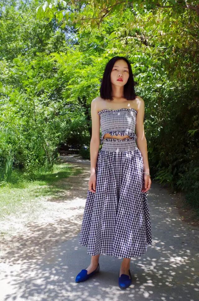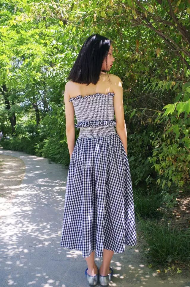 搭配:smocked top(弹力褶皱上衣)+裤裙+蓝色渐变豆豆鞋亮点:套装凸显出了妹子的芊芊细腰和肩部曲线,蓝色的豆豆鞋的搭配也使得整套偏素雅的格子元素活泼了许多。