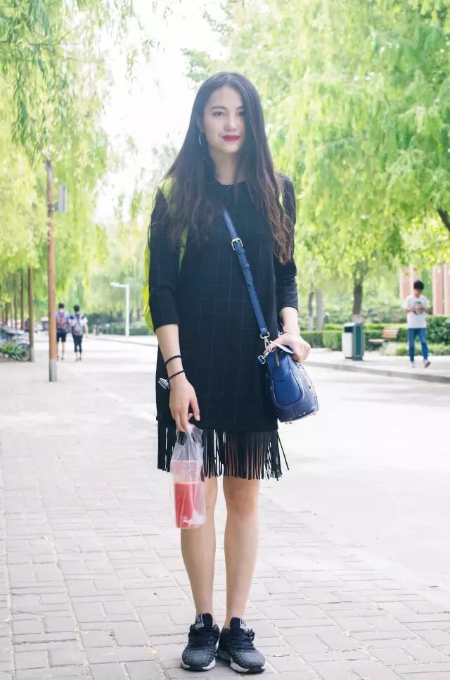 亮点:黑色穿搭当然要配上大红唇才出彩,加上自然卷发,人群中不亮眼那可真是很奇怪了!方格子使裙子多了一点活泼的元素,流苏的设计使得裙子灵动起来,即使是简单黑色运动鞋的搭配,也让人觉得很特别。