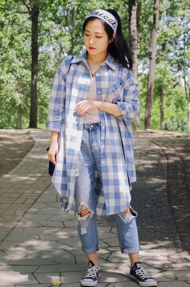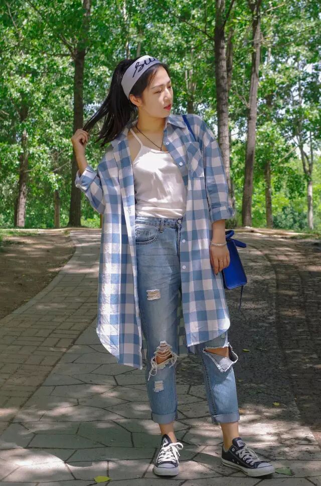 搭配:格子衬衫+白色吊带+破洞牛仔裤+经典低帮帆布鞋+白色发带亮点:我们通常都是饰品来配衣服,这个妹子可就厉害了,她拿衣服配饰品。整身衣服的穿搭和橘色妆容都是为了搭配一款白色发带,可谓是花了不少心思,完美诠释出了活力校园风!这身穿搭可是让潮妹回味了好多天!若是你在校园里遇见这样的女生,是不是总想要多看几眼呢?
