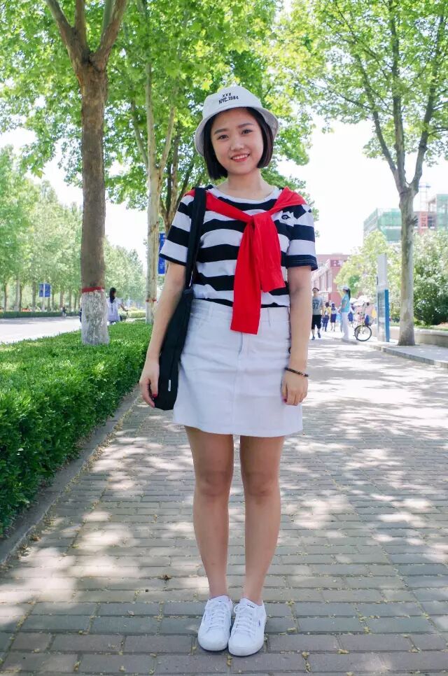 搭配:条纹Tee+红色披肩+A字裙+白色帆布鞋+渔夫帽+黑色单肩包亮点:小清新中又带有一些俏皮可爱的条纹t恤加上红色披肩,在人群中非常亮眼,搭配白色高腰A字群,再加上一款既可以遮阳又可爱的渔夫帽,妹子,你还缺姐姐吗?!