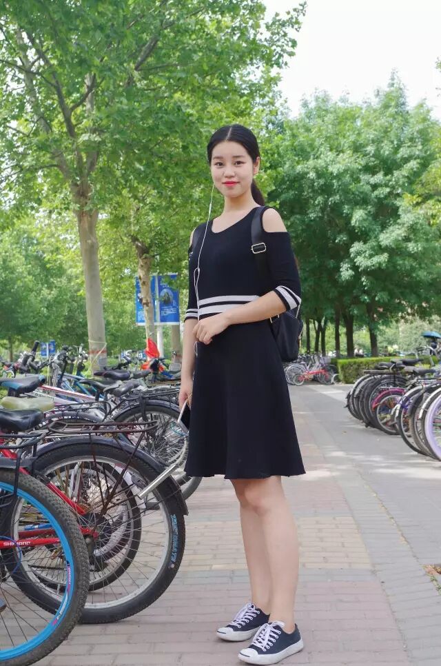 搭配:黑色收腰漏肩连衣裙+经典开口笑帆布鞋+黑色真皮双肩包亮点:简单的穿法也能吸引目光的秘诀就是妹子的妆容。白皙的皮肤,豆沙粉色口红,有条不紊的低马尾给人一种很精致的感觉,让潮妹不由得驻足多看两眼!