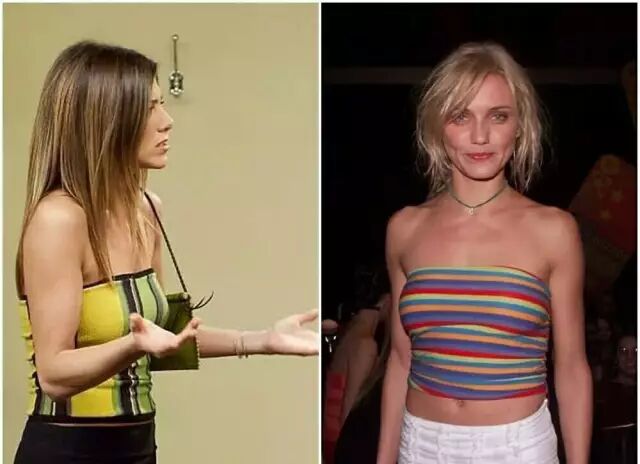 在大学校园中看到穿smocked top(弹力褶皱上衣)加裤裙的妹子是非常出乎潮妹的预料的,无肩带抹胸是2000年代特别流行的单品,熟悉《老友记》的盆友应该非常了解这个款式的衣服,瑞秋女神好像特别偏爱这款tube top,还有年轻时候的gigi姐。