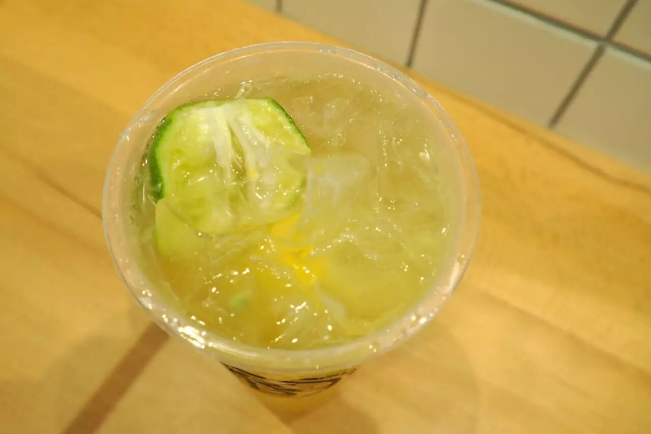 两颗小青桔切半,配三片柠檬,对于500毫升的容量来说感觉有些吝啬了。不过可能是为了追求清爽的口感吧,结果第一口下去居然还挺酸,略有涩感,不知道是迷你的青桔还是那微弱的三片柠檬起了作用?总觉得不仅仅如此。总体还是好喝的,相比很多甜的齁死人的柠檬水这个略酸的喝起来更解渴。