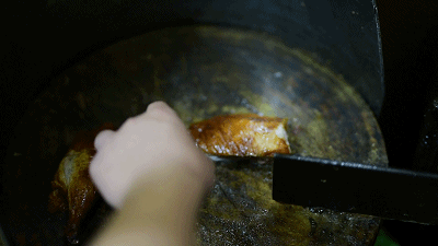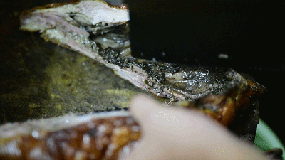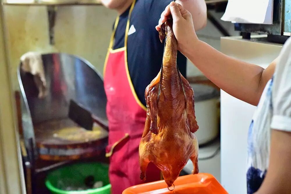 刚到店里,老板就说我们来的正是时候,烧鹅快出炉了,这次吃个热的,脆皮的!刚出锅的烧鹅香的没边,油汪汪的脆皮看着馋人。赶紧让老板拎出来一整只烧鹅,上案板就开始卸腿!
