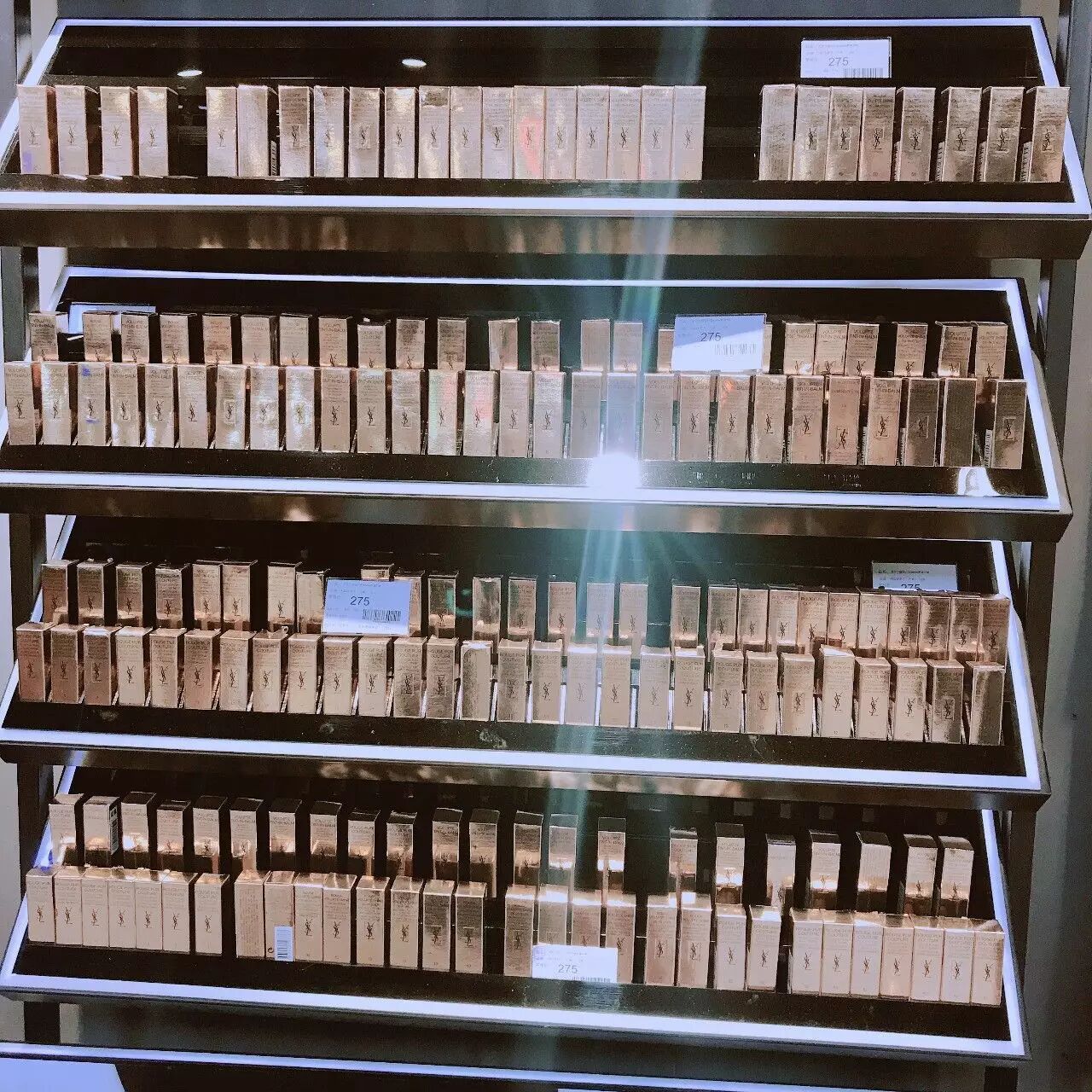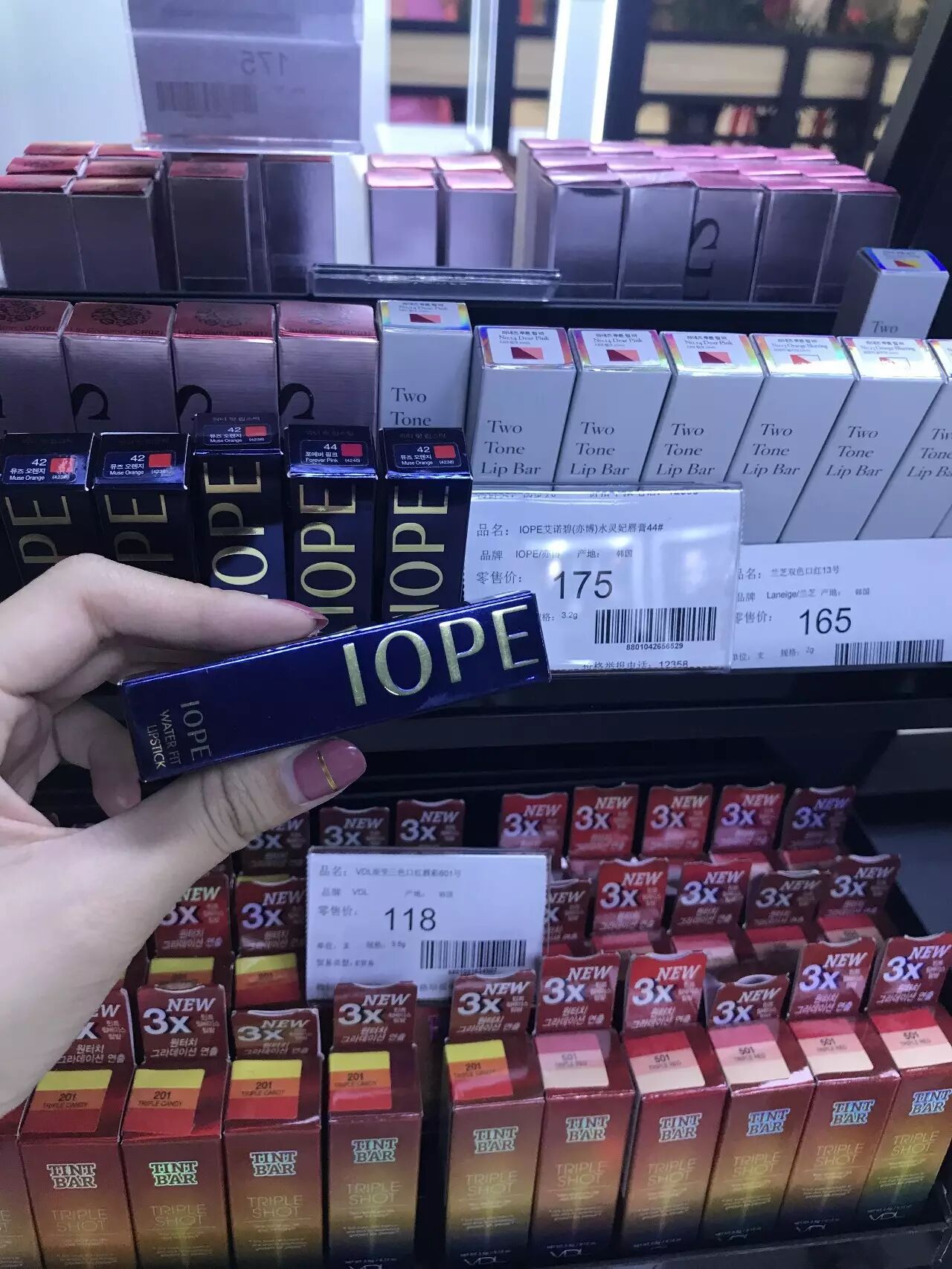 如果说进店后你被悦诗风吟、自然乐园、兰芝、依云等等缠住了脚,那么整体靠墙位置的口红墙,不仅闪瞎你的眼而且所以国际一线彩妆这里都有,阿玛尼、香奈儿、Dior、纪梵希、MAC、娇兰、雅诗兰黛、SKⅡ、雪花秀、IOPE、呼吸等等的品牌这里都有。在抠红墙色号较多,价位也基本上稳定在255元-275元之间,有部分日韩彩妆的口红折后是30-80元,所以种类还是比较多的,满满一面的口红墙,何止是少女也是每一个小姐姐的梦想。