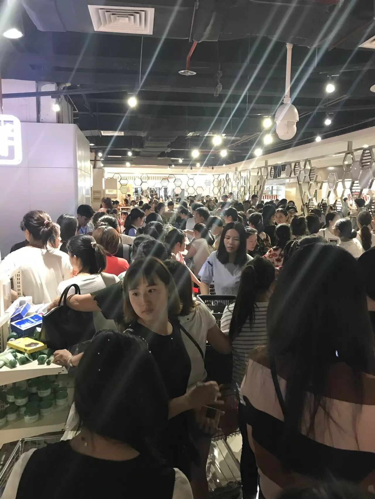 所以药妆馆依靠折扣力度实力圈粉,因此现场是这样人人人人人……大家都在抢抢抢抢……本身潮妹真心也想囤一些面膜和护肤品,但是排队太让人揪心,就果断放弃。因为这个馆内是自主收银,要是真有毅力的宝宝,以这个趋势预估,结账的打底时间是2个小时,大家可以参考一下。