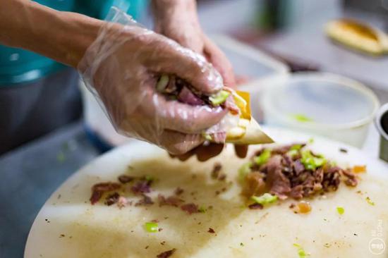 吃驴肉火烧我偏爱肉加驴板肠的搭配,