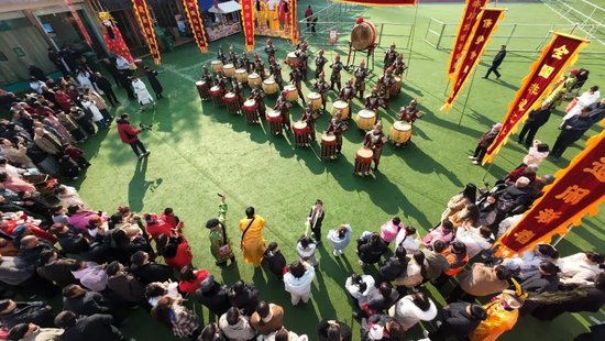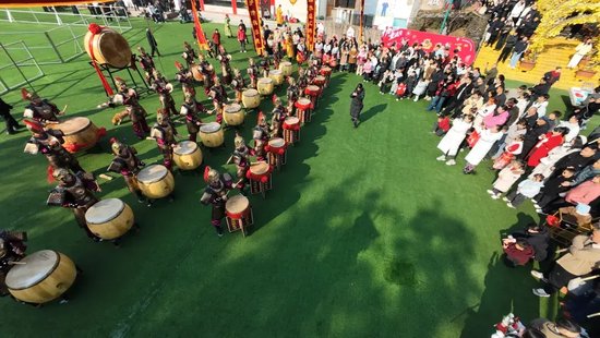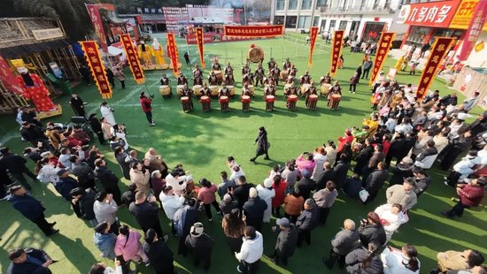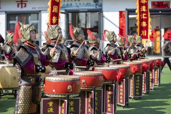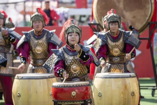 紧接着,气势恢宏的非遗鼓乐**《秦王点兵》**登场,激昂铿锵的鼓点、整齐划一的表演,瞬间点燃全场热情,雄浑大气的传统乐章,让游客沉浸式感受非遗文化的独特魅力。