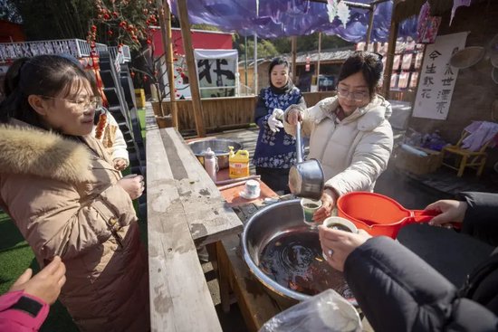 创意互动环节趣味满满,游客踊跃参与,在轻松欢乐的氛围里感受浓浓年味。与此同时,景区精心准备的老式手摇爆米花、驱寒姜枣茶暖心上线,香甜与温暖相伴,让每一位游客都倍感舒心。