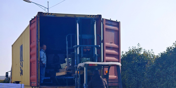 图为洛阳五羊三轮摩托车有限公司厂区内即将出口非洲的待组装零件正在装车。