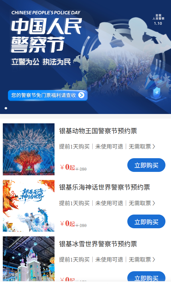 在第六个中国人民警察节来临之际,郑州银基国际旅游度假区推出对人民警察的专属免票优惠:1月10日当天凭本人身份证及人民警察证,可免费游玩银基动物王国、银基冰雪世界、银基乐海神话世界、银基黄帝宫御温泉四大园区,一名成人还可携带一名1.1米以下的儿童入园。同时在此温馨提醒,游客需至少提前一天在银基度假区官方小程序进行预约。