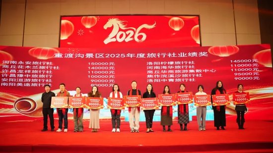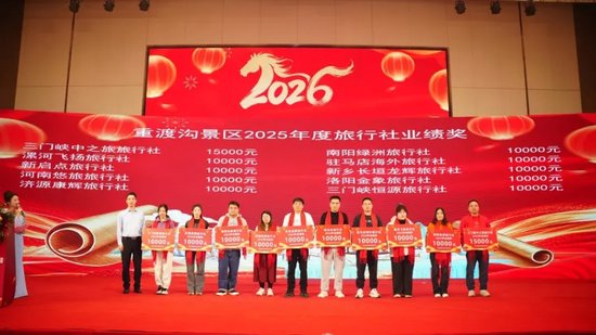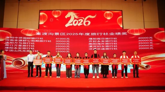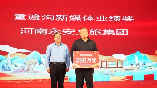 现场特别颁发2025年度重渡沟新媒体业绩奖,河南永安文旅集团斩获该奖项。集团孙总登台领奖并分享经验,他表示,集团布局主流新媒体平台,围绕重渡沟核心亮点创作优质内容,实现了线上流量与线下客源的高效转化,未来将继续创新营销模式,助力景区品牌升温。