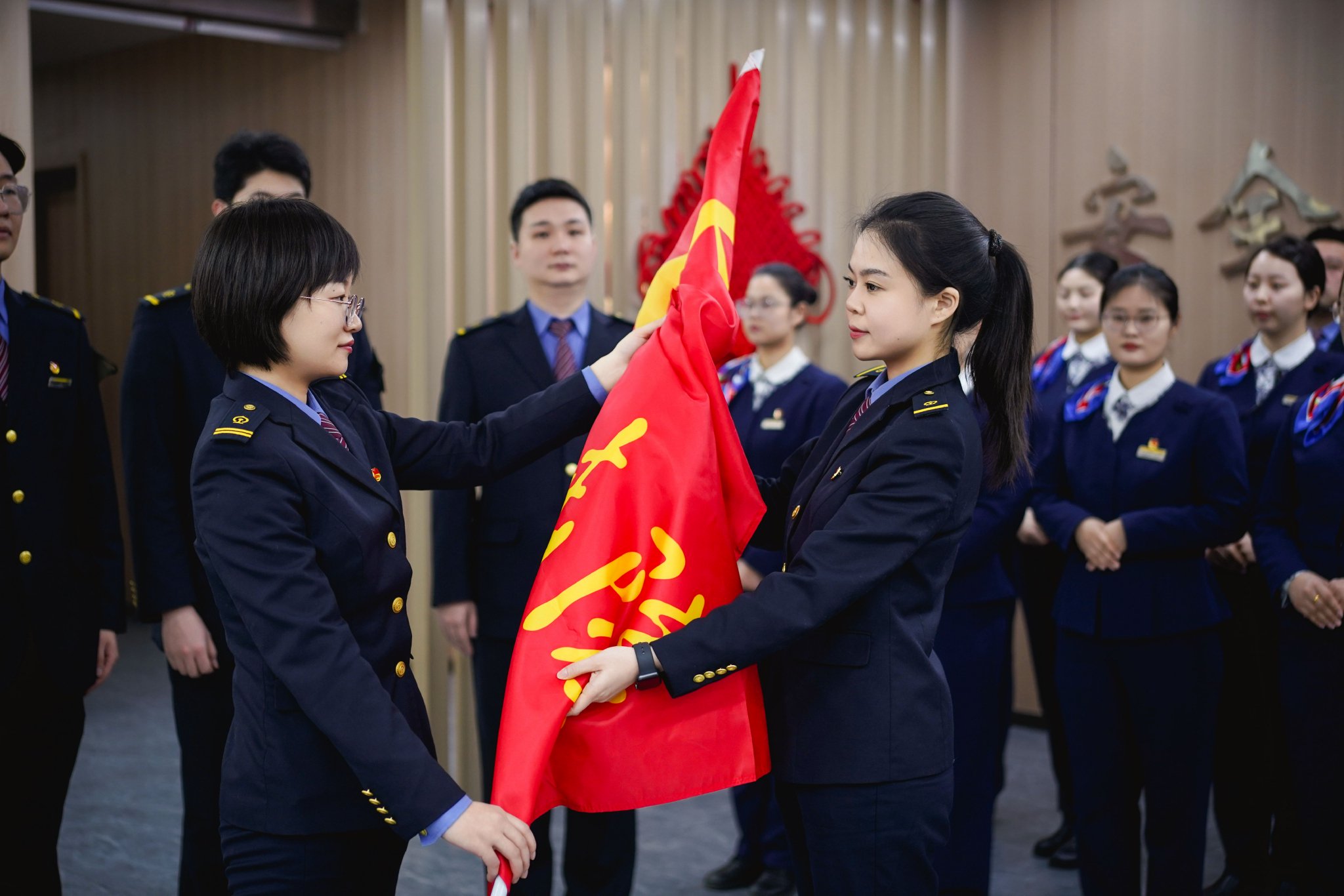 “燃动青春,决战春运,不畏艰难、冲锋在前。” 1月29日,郑州客运段高铁四队青年突击队员接过团旗郑重宣誓。