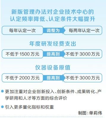 据介绍,相较于2016年版管理办法,新版管理办法对企业技术中心的认定频率降低、认定条件大幅提升,比如由每年认定一次调整为每两年认定一次,年度研发经费支出由不低于1500万元提高到不低于3000万元,仪器设备原值由不低于2000万元提高到不低于3000万元,更加注重对企业创新投入、创新条件、成果转化、产学研用和人才等方面的综合评价,引入了更多量化指标和权重,标志着从单纯的能力认定转向创新生态的系统构建。