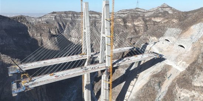 百米高空,以索塔为中心,大桥主梁像展开的双臂奋力伸向两侧悬崖,密集的粗壮钢索牢牢拉住每段桥体。目前,主梁施工整体进度已达61%。大桥完工后,将衔接应天寨隧道与青龙山隧道。