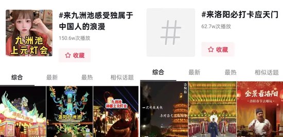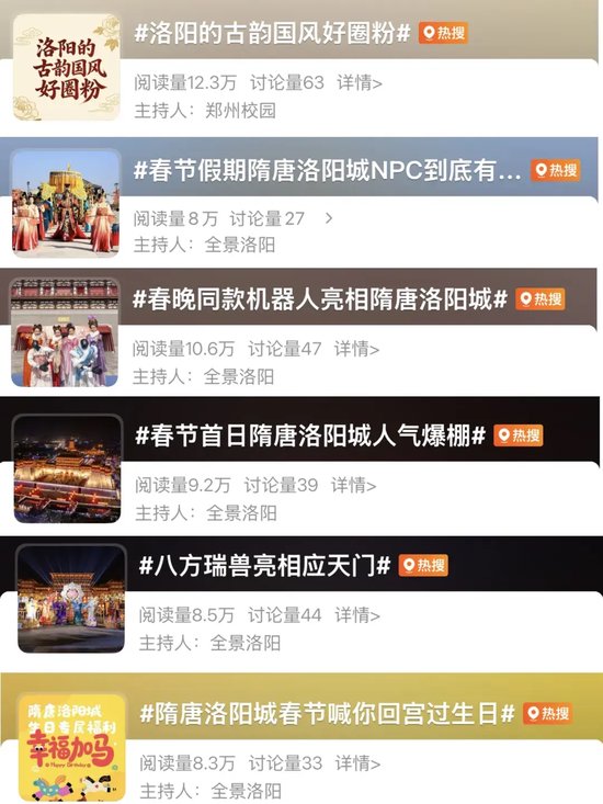 微博平台上,#八方瑞兽亮相应天门##隋唐洛阳城宠客加场延时闭园##春晚同款机器人亮相隋唐洛阳城##春节首日隋唐洛阳城人气爆棚##隋唐洛阳城春节喊你回宫过生日##春节假期隋唐洛阳城NPC到底有多好玩# 等活动相关话题均登上同城热搜榜。抖音平台上,相关话题#来洛阳必打卡应天门##来九洲池感受独属于中国人的浪漫# 登上抖音洛阳榜。