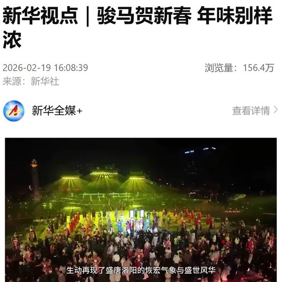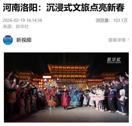 2月17日,新华社客户端连续发布《新华视点|骏马贺新春 年味别样浓》《河南洛阳:沉浸式文旅点亮新春》,两条新闻共同关注报道隋唐洛阳城景区以实景演艺为载体,打造“仪式观礼、情景入戏、互动共生”的沉浸式新春文旅新体验。