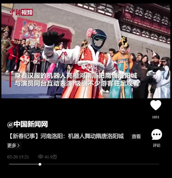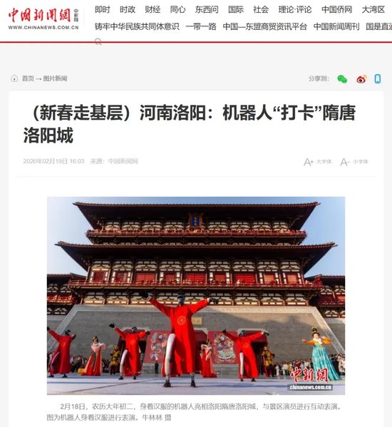 2月19日、20日,中国新闻网分别发布《河南洛阳:机器人“打卡”隋唐洛阳城》和《新春纪事丨河南洛阳:机器人舞动隋唐洛阳城》,关注报道大年初二,身着汉服的机器人亮相洛阳隋唐洛阳城,与景区演员进行互动表演。