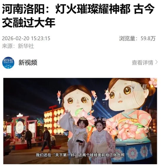 2月20日,新华社客户端发布《河南洛阳:灯火璀璨耀神都 古今交融过大年》,视频镜头展示九洲池灯会的独具匠心与美轮美奂。