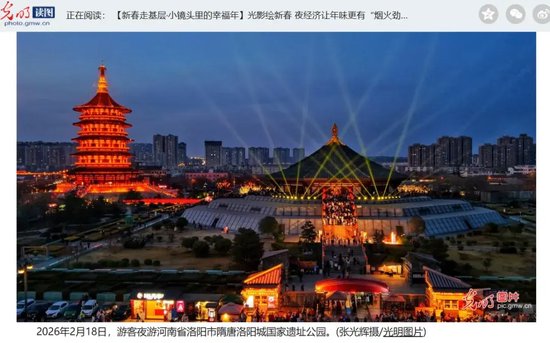 2月21日,光明网发布《新春走基层·小镜头里的幸福年丨光影绘新春 夜经济让年味更有“烟火劲”》,展示各地流光溢彩的夜色,隋唐洛阳城明堂天堂夜景在其中精彩亮相。