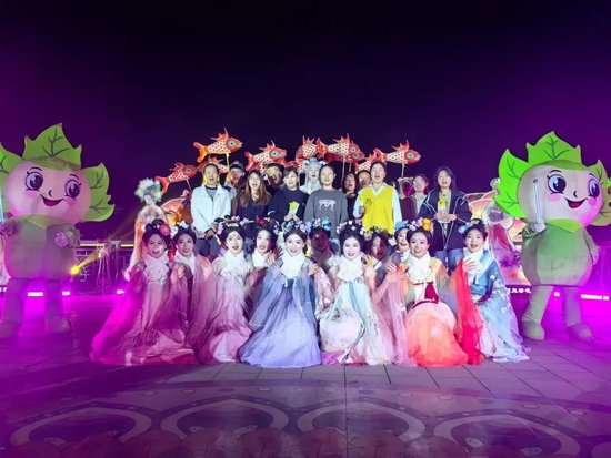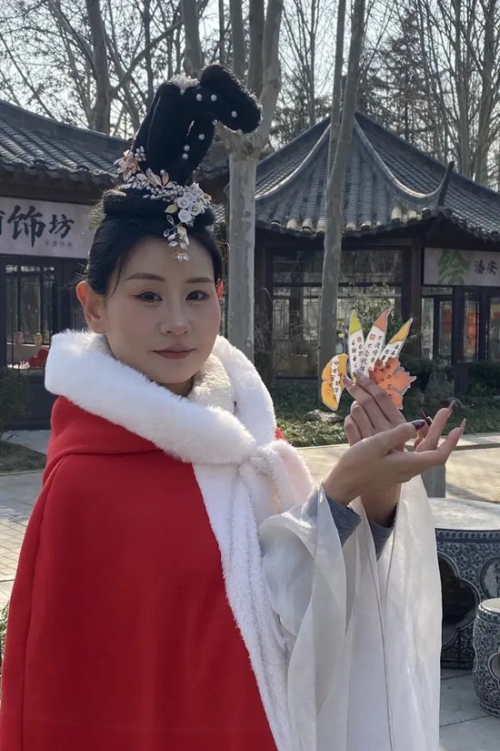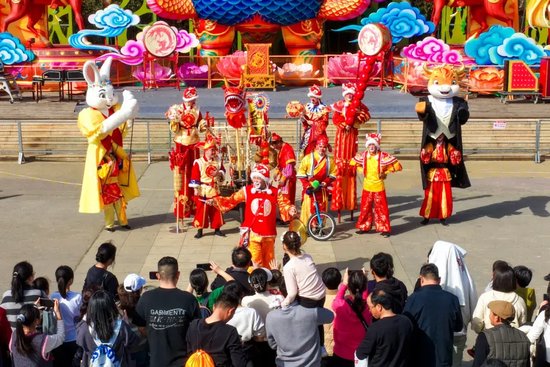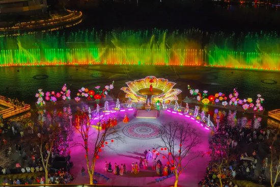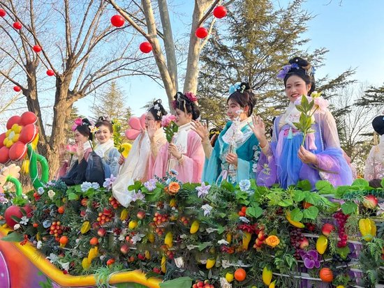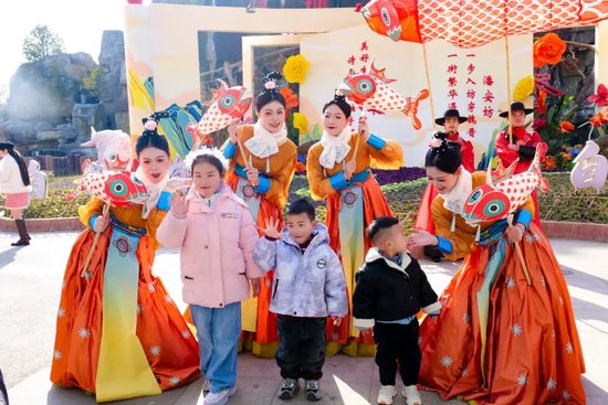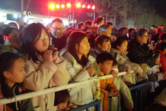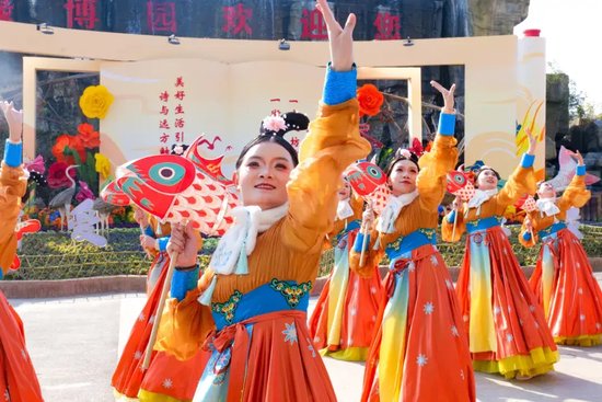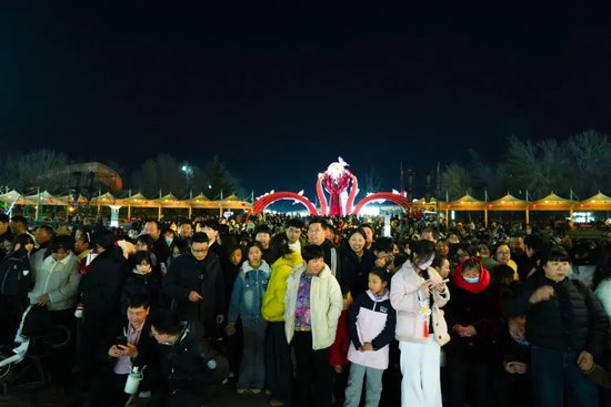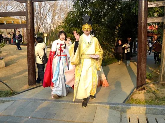 白昼的美好,藏在5万株百合织就的浪漫花海中。智能温室内,百合缀满枝头,与红金福字交相辉映,构成“百花迎春,万福临门”的吉祥画卷,定格了一个又一个阖家团圆的温馨时刻。北门广场的古彩魔术、国潮卖货郎点燃全场热情,箜篌湾的千年古音穿越时空,潘安坊街区内,“潘安”与才子佳人缓步巡游,送花神票,让每一位游客都沉浸式融入古风意境,成为这场新春盛宴的“剧中人”。