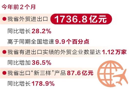 出口向“新”向“绿”发展。前2个月,我省出口“新三样”产品87.6亿元,同比增长178.9%;出口高端装备16.3亿元,同比增长55.4%;出口生物医药1.7亿元,同比增长34.2%;出口工业气体净化装置0.3亿元,同比增长1.1倍。