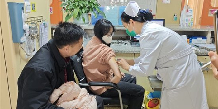父亲杨振亚陪着女儿杨可欣打动员针。受访者供图