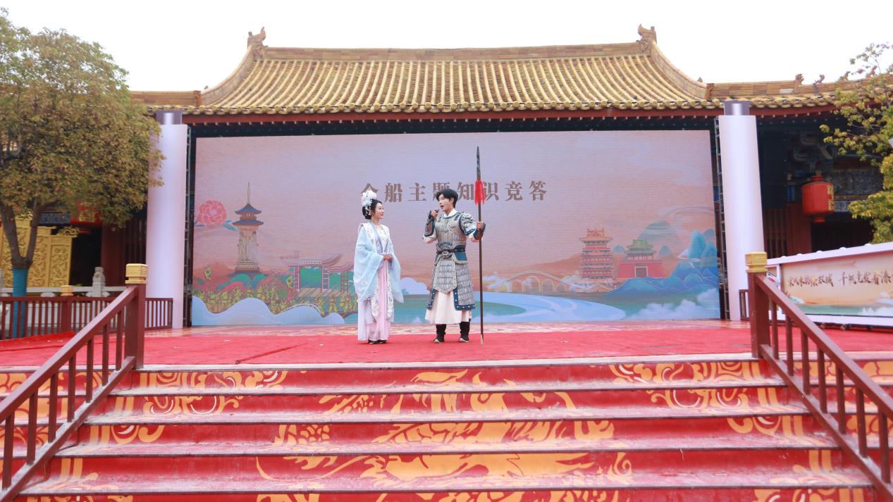 趣味互动环节将现场氛围推向高潮。清明上河园岳飞NPC惊喜登场,紧扣溱潼会船节的历史渊源、民俗流程开展竞答,从会船的起源传说到现代会船节的五大篇章,从贡船造型到篙船竞技,在轻松愉悦的氛围中,大家加深了对会船文化的了解。“旱地拔蒿”实景体验则让嘉宾亲身感受会船乐趣,四组嘉宾组队比拼,仿真会船道具搭配趣味规则,沉浸式还原会船竞技的热闹场景,欢声笑语中尽显水乡运动的独特魅力。