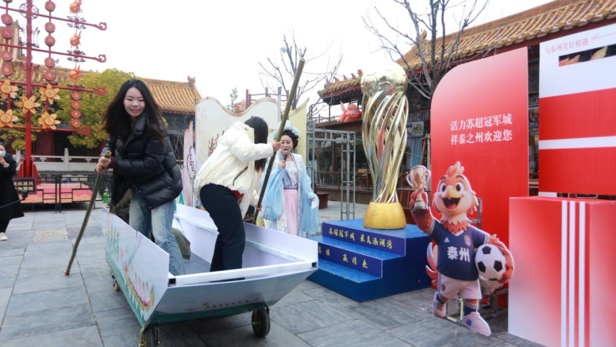 上午9时,清明上河园四方院内已是人流如织。“宋迎水乡客”沉浸式签到体验区前,嘉宾争相打卡。会船主题打卡区将清明上河园与溱潼会船节千舟竞渡的盛景巧妙融合,让人仿佛置身百舸争流的溱湖之畔;美食品鉴区里,鱼汤面、蟹黄包等泰州早茶香气四溢,提前唤醒味蕾对水乡的向往。身着宋服和“苏超”泰州队服的NPC穿梭其间,蹴鞠互动、银票派送,让现场提前感受到溱潼会船节的热烈氛围。