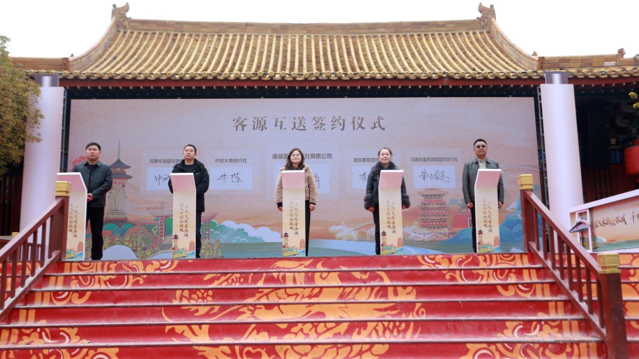 推介环节,溱湖文旅金牌导游以溱潼会船节为核心,详细介绍姜堰特色美食、精品旅游线路、“姜堰旅游”小程序及重磅优惠政策。溱湖国际旅行社与河南中诚国际旅行社、开封大乘旅行社等签订客源互送协议,重点包含溱潼会船节观摩行程;清明上河园国际旅行社与溱湖文旅集团签订战略合作协议。河南至姜堰“春季赏花看会船”专列正式启动,让更多中原游客能够便捷奔赴溱湖,感受会船文化的独特魅力。